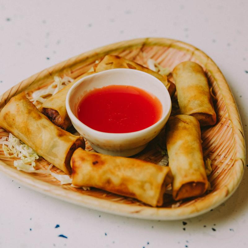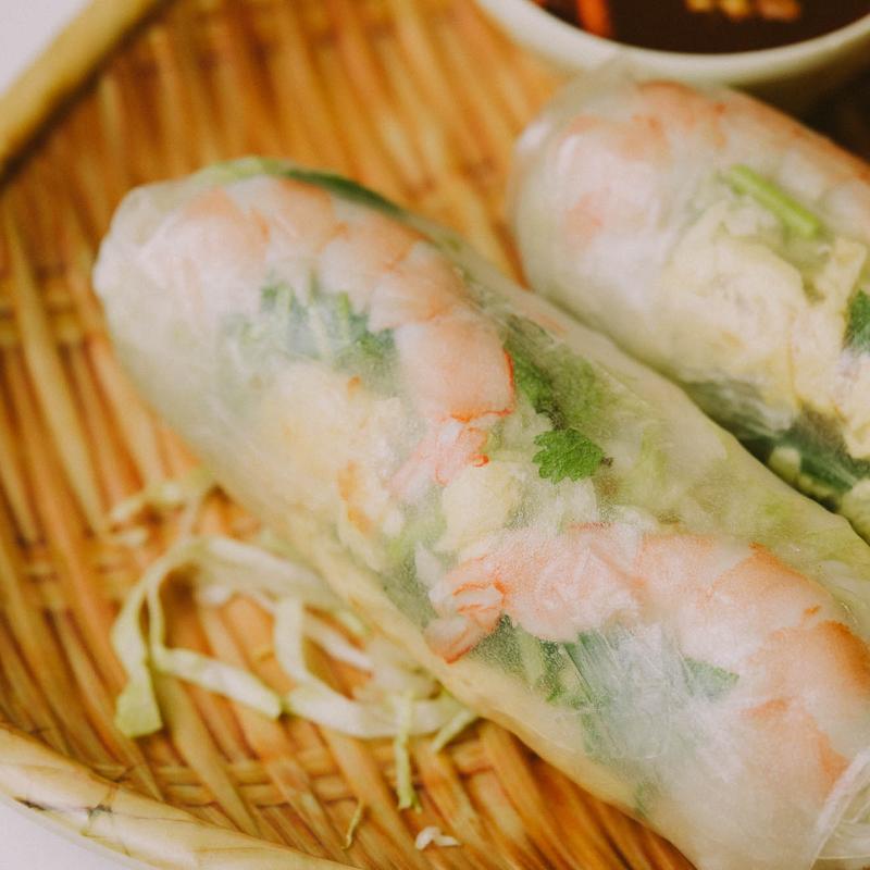 Rice paper wrap with pork, shrimp, vermicelli, mint, lettuce, shredded egg, cucumber, and crispy stick - 2 pieces.