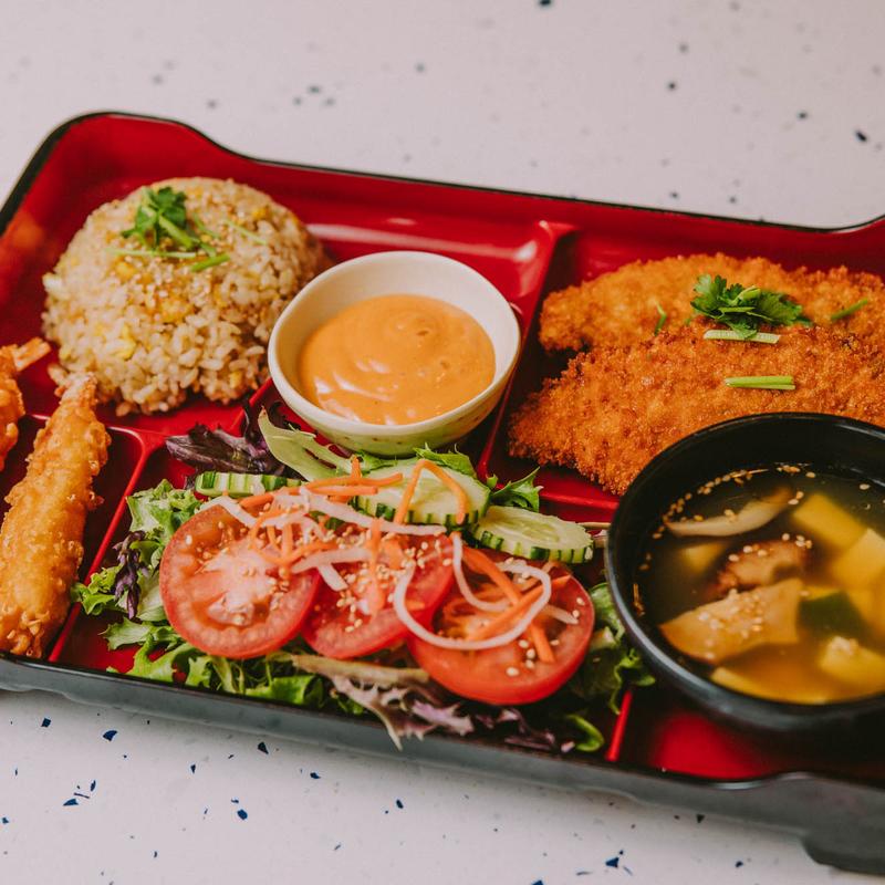 Japanese style fried boneless chicken breast, served with white rice and tonkatsu sauce