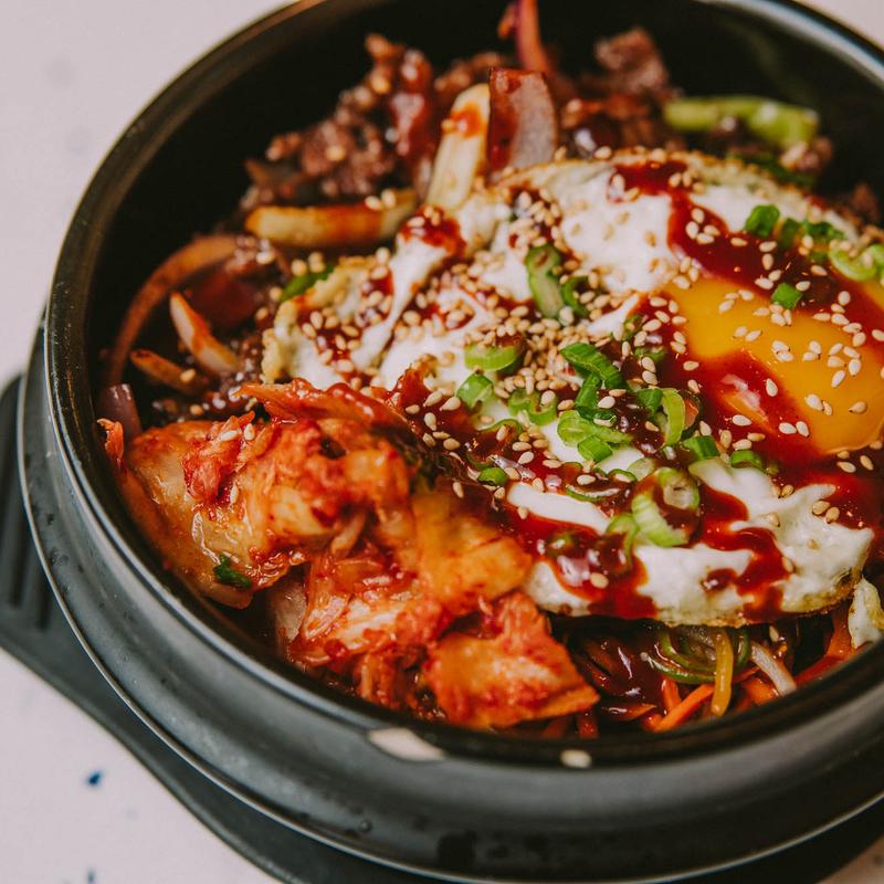 Spicy Beef, fishcake, veggies & onion, sesame seed, seaweed, beansprout, egg, hot pepper paste with white rice.