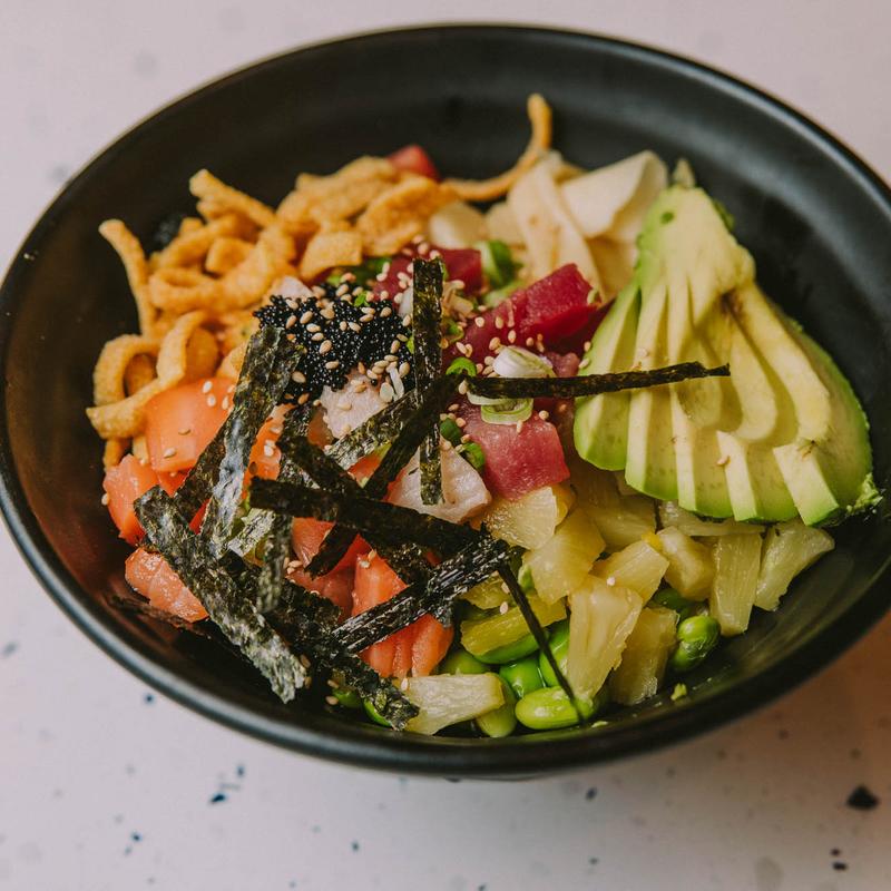 Salmon, Tuna, Yellow Tail, cucumber, edamame, pineapple, mango, tomato, avocado, seaweed salad, PONZU & SPICY MAYO sauce top with ginger, scallion, sesame seed, roasted seaweed, massage, wonton crisp and WASABI.
