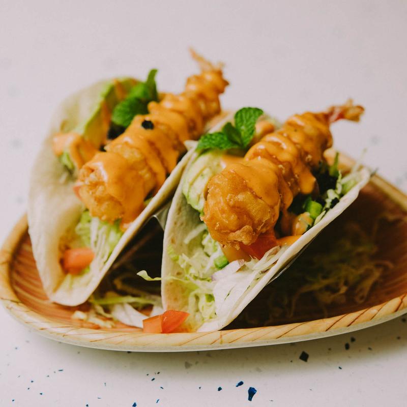 Shrimp tempura with lettuce, jalapeño, avocado , tomato, cucumber top with spicy mayo, massage, cilantro and sesame seed.